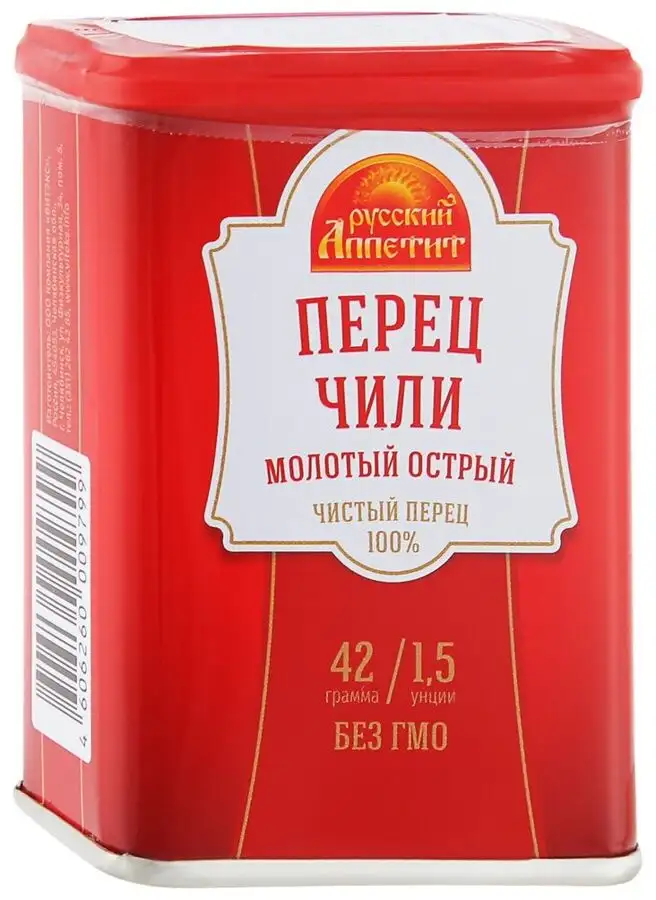 Перец молотый Русский Аппетит чили 42г ж/б в красивой железной баночке в стиле Ретро - это превосходный и насыщенный специализированный приправа, которая придаст вашим блюдам глубину и изысканный аромат. Этот черный молотый перец был тщательно отобран и обработан, чтобы сохранить свою интенсивность и свежесть. Отльчное качество и насыщенный ароматный. Каждая крошка перца Русского Аппетита черного молотого прошла строгий процесс перемола, чтобы обеспечить однородность и оптимальный размер частиц. Это гарантирует, что каждое блюдо, которому будет добавлен этот перец, будет иметь однородное и равномерное распределение аромата и остроты.