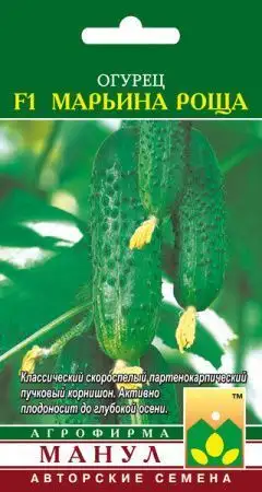 Огурец F1 Марьина роща - высокопродуктивный скороспелый партенокарпический пучковый корнишонный гибрид женского типа цветения для открытого и защищенного грунта. Характеризуется стабильно высоким урожаем в любых условиях, плодоносит до глубокой осени. Растения сильнорослые, с хорошим отрастанием боковых побегов, холодостойкие. В узлах формируется от 2-3 до 4-5 завязей. Теневынослив. Благодаря высокой партенокарпии и сильному проявлению гетерозиса на каждом растении может одновременно наливаться до 10-12 плодов! Зеленцы интенсивно-зеленой окраски, бугорчатые, белошипые, длиной 10-12 см, плотные, хрустящие, ароматные. Бугорки крупные, расположение бугорков средне-частое. Засолочные и вкусовые качества очень высокие. Гибрид устойчив к мучнистой росе, оливковой пятнистости, вирусу обыкновенной огуречной мозаики, толерантен к ложной мучнистой росе, корневым гнилям. Плотность посадки в теплицах 2,5 раст./м2, в открытом грунте 3-4 раст./м2.