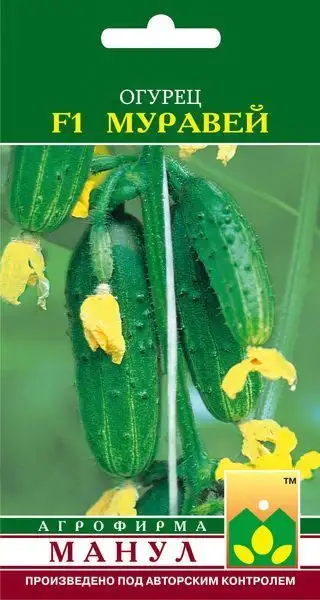 Семена Огурец Муравей F1. Огурец F1 Муравей - очень скороспелый партенокарпический пучковый корнишонный гибрид женского типа цветения для открытого грунта, теплиц, тоннелей. В плодоношение вступает на 37-38-й день от всходов. Ветвление ограничено (короткие боковые побеги). В узлах формируется от 2-3 до 5-7 завязей. Чем выше освещенность, тем становится больше завязей. Зеленцы крупнобугорчатые, белошипые, длиной 8-11 см, засолочные, вкусовые и консервные качества очень высокие. Активное образование зеленцов благодаря сильной партенокарпии наблюдается с самых нижних узлов стебля практически при любых погодных условиях. Плотность посадки в теплицах 2,5-3 раст./м2, в открытом грунте 3-5 раст./м2.