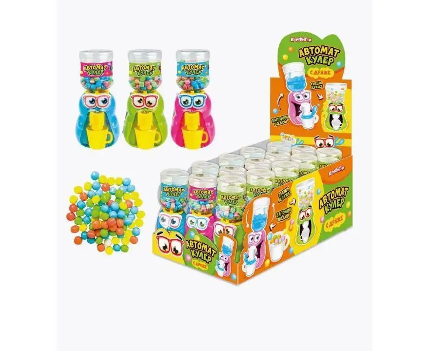Мини-автомат в виде кулера, внутри которого находятся конфетки-драже. Съешьте сладости из канистры, залейте в ёмкость любую жидкость: воду или сок и наслаждайтесь настоящим мини-кулером! Такая функциональная игрушка с драже – отличный сувенир, который можно будет использовать снова и снова