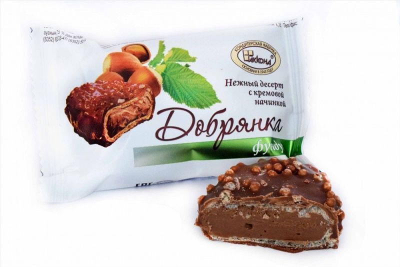 Конфеты Добрянка фундук 2 кг - это глазированный десерт с кремовой начинкой с добавлением крупки фундука в вафельном корпусе с обсыпкой воздушным рисом.