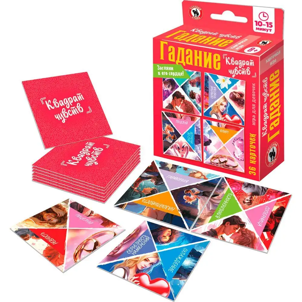 «Квадрат чувств» – простое увлекательное гадание, поможет заглянуть в сердце любимого или интересующего человека, выяснить перспективы в отношениях и ответить на волнующие вопросы. В наборе 36 квадратных карточек, на каждой карточке изображено 4 половинки картинки. Карточки раскладываются рядами по 6 штук в 6 рядом. Цель – собрать изображение из двух половинок. В процессе раскладывания карточки можно поворачивать, так, чтобы большее количество картинок совпало. Сложившиеся изображения и надо трактовать в качестве ответа. Самые важные предсказание – те, что совпали сразу при раскладывании пасьянса.Количество игроков: 1Возраст: 8+Состав игры: карточки – 36 шт., правилаМатериал: картон, бумага