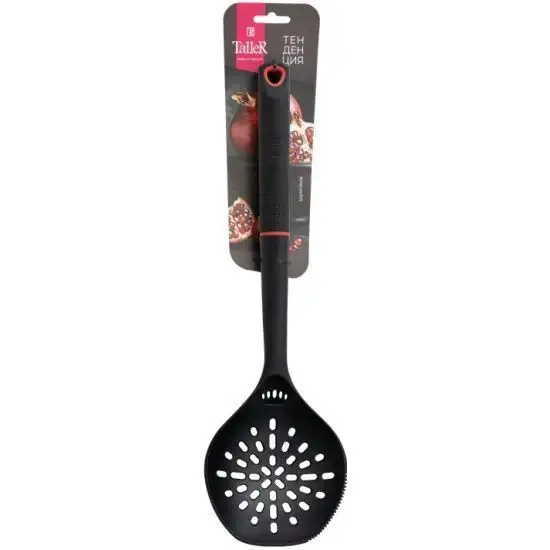 Шумовка TalleR TR-51423. Товар оригинальный и новый. Официальная Гарантия по России. Надежная упаковка заказа. Устойчивость к температуре до 180° В ручке предусмотрено отверстие для подвешивания Можно мыть в посудомоечной машине. Не используйте для мытья кухонных принадлежностей TalleR абразивные моющие средства и металлические мочалки, т. к. появление царапин испортит внешний вид изделия. Внимание! Не рекомендуется оставлять изделие на раскаленной поверхности.