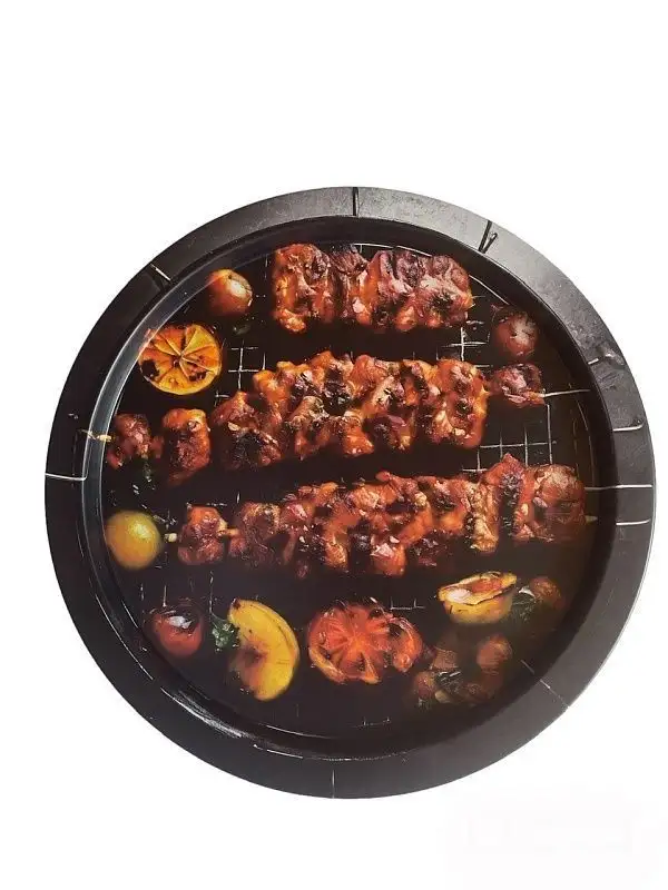 Поднос жестяной "Шашлык" 32см.. Поднос выполнен из пищевой жести которая отличается прочностью, экологичной безопасностью и износостойкостью. Рисунок нанесен методом литографии, который позволяет получать четкое насыщенное изображение высокого качества с максимальной детализацией. Металлический поднос можно использовать не только как элемент декора для квартиры, но и как отличный органайзер для хранения вещей. Круглый поднос отличный вариант для сервировки блюд и закусок на вашем столе. Декоративный поднос из металла позволит сделать сервировку стола более изысканной и даже превратит простое чаепитие в настоящий праздник стиля и элегантности.