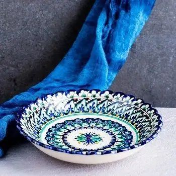 Эта глубокая тарелка из риштанской керамики с узором МИКС и растительным орнаментом в синем цвете станет практичным дополнением сервировки. Диаметр 20 см позволяет подавать горячие и холодные блюда, супы или салаты. Ручная работа и гладкая текстура подчеркивают уникальность каждой посуды, а круглая форма обеспечивает удобство при использовании.
