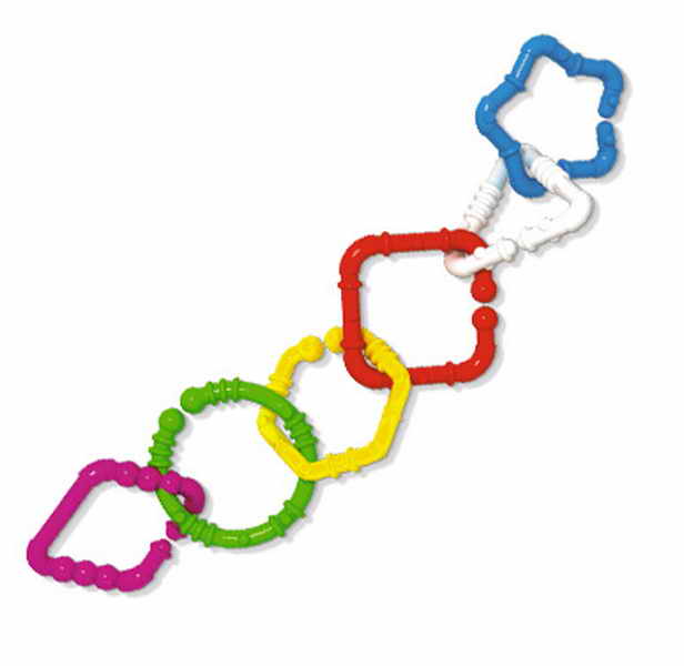 Возраст: 0+. Погремушка составлена из отдельных звеньев разного цвета.Каждое изогнуто в виде определенной геометрической фигуры.Толщина пластмассовых палочек 5 мм., они все испещрены выпуклостями, ободочками, пимпочками. Такая рельефная поверхность служит дополнительным тактильным раздражителем для пальчиков и языка младенца.Разнообразие сигналов из внешнего мира способствует активному развитию мира внутреннего.Каждое звено цепи упруго размыкается как клипса, можно разъять цепочку.