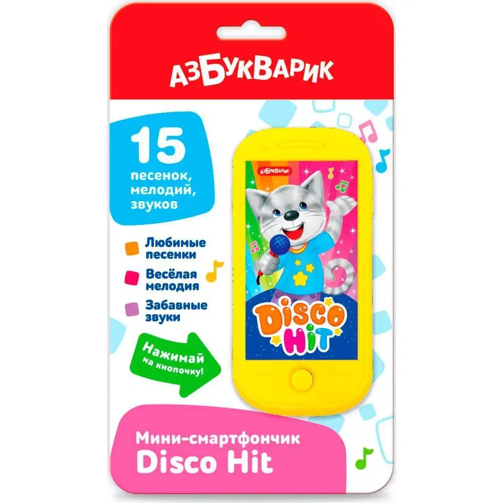 Игрушечный телефончик со звуком «Disco Hit» от бренда «Азбукварик» понравится каждому малышу. Он современный и яркий, с веселым котенком на дисплее. Как только малыш нажмет на кнопочку, телефон сыграет 15 разных мелодий, песен, звуков. Вместе с музыкальной игрушкой малыш выучит веселые детские хиты: «Если весело живётся, делай так», «Котёнок-веселушка», «У друзей нет выходных», «Пляшут весело детишки», «Что такое праздник?» и другие. Мини смартфон поможет ребенку развить память и музыкальный слух. К тому же игрушечный телефончик похож на настоящий смартфон. На яркую кнопочку захочется нажимать снова и снова. Ваш малыш сможет играть с ним в игры по ролям, что поможет ему быстрее адаптироваться в обществе. Смартфончик способствует речевому развитию ребенка, формирует коммуникативные качества и музыкальные способности, а также положительно влияет на развитие мелкой моторики! Игрушка идеально подойдет для маленьких ручек благодаря небольшому размеру и закруглённым уголкам.