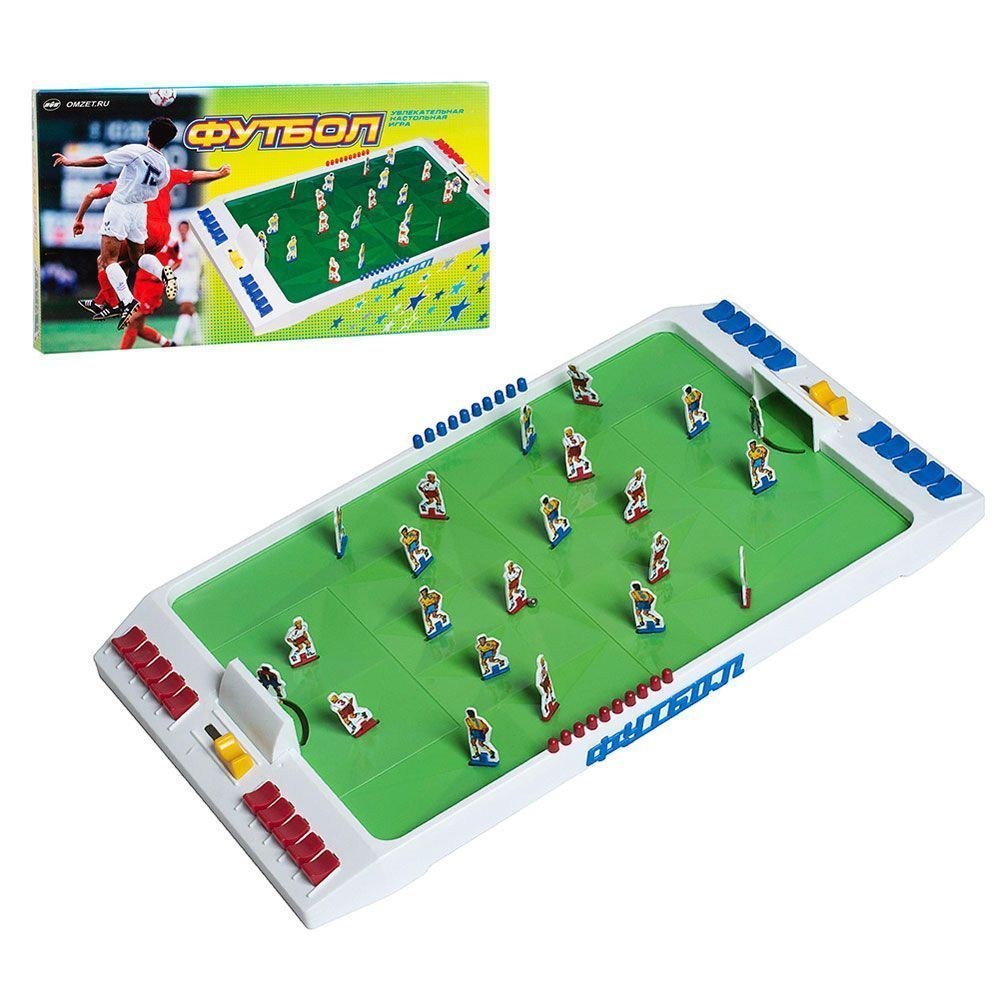 Настольная игра "Футбол" 850 /Омский завод электротоваров/ вырабатывает меткость движений и быстроту реакции.Настольный «Футбол» предназначен для игры детей дошкольного и школьного возраста. Игра вырабатывает быстроту реакции, меткость и точность движения. Состоит из игрового поля, обрамлённого барьером. На поле располагаются две футбольные команды (красная и синяя) из 11 футболистов каждая. Управление футболистами осуществляется клавишами. Мячом является стальной шарик. Счёт забиваемых голов ведётся фишками (красными и синими). Игроки плоские, а перед игрой необходимо наклеить липкую аппликацию. Размер игрового поля 43*28 см.