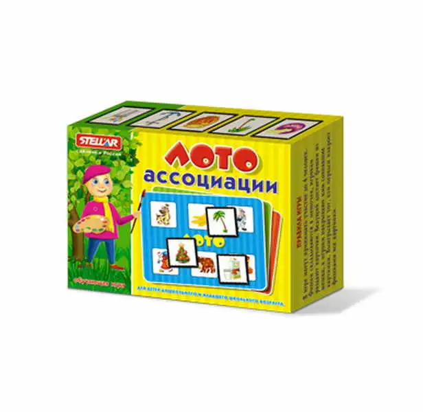 Возраст: от 3 лет. Лото «ассоциации» поможет малышу научиться связывать предметы по признакам и развить память, внимание и усидчивость. В наборе карточки с разными картинками . А в мешочке картинки с которыми можно связать картинки на карточке. Ведущий достает карточку и показывает ее всем, тот, у кого на карточке есть ассоциация, закрывает этой карточкой свое изображение. Через несколько минут от начала игры ребенок поймет цель игры и узнает много нового и интересного.