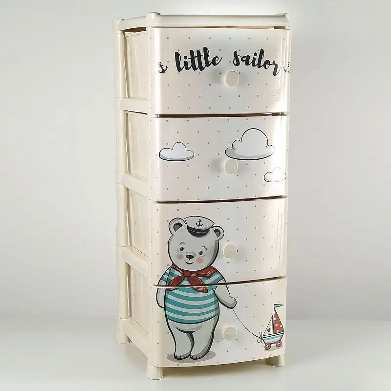 VIOLET Комод 4-х секционный с декором и ручками Хеппи Кидс с четырьмя выдвижными ящиками предназначен для хранения вещей и продуктов питания. С помощью практичного пластикового комода вы правильно организуете хранение вещей. Изделие имеет жёсткую конструкцию за счёт цельных боковых стенок. Отсутствие острых углов делает его безопасным для ребёнка. Комод изготовлен из экологически чистого материала, не содержит вредных веществ.