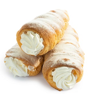 Трубочка со сгущенкой, 75г - это пирожное в виде рожка из слоёного теста, заполненного кремом из взбитых сливок и варёного сгущённого молока. Верх посыпан сахарной пудрой.