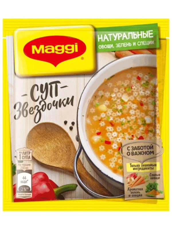 Суп Maggi Звездочки 54г – сухая смесь, которая содержит все необходимое для приготовления вкусного, ароматного и питательного супчика со звездочками. В состав входят только знакомые ингредиенты: лук, чеснок, морковь, вермишель высшего сорта, паприка, йодированная соль, травы, душистые специи. Приготовить суп сможет даже начинающий кулинар: просто высыпьте содержимое упаковки в 1 литр кипящей воды, тщательно перемешайте, доведите до кипения, а затем варите 8-10 минут на медленном огне. Чтобы блюдо получилось еще более сытным, можете добавить в него картофель. Maggi – всемирно известный бренд, который заботится не только о вкусе выпускаемых продуктов, но и о качестве ингредиентов, входящих в их состав.