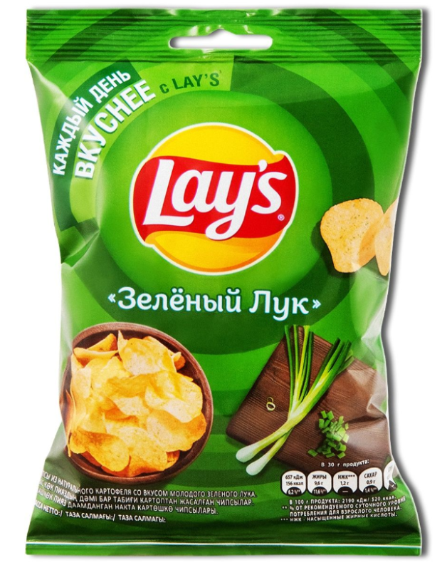Чипсы из натурального картофеля. Готовы к употреблению. Хрустящие золотистые чипсы Lay`s – это отличное сочетание отборной картошки, растительного масла и вкусовых добавок. Лейс Зелёный лук – настоящее удовольствие для всей семьи! Тонкие хрустящие чипсы LAY`S золотистого цвета имеют выраженный вкус молодого лучка, который приобретают благодаря добавлению ароматических веществ. Чипсы Лейс быстро утоляют чувство голода, поэтому подходят для перекуса в течение дня. LAY`S удобно брать с собой в дорогу, на прогулку или на занятия. Чипсы Лейс можно использовать в кулинарии при приготовлении салатов и закусок. Вакуумная упаковка Лейс способствует сохранности продукта без дополнительных консервантов.