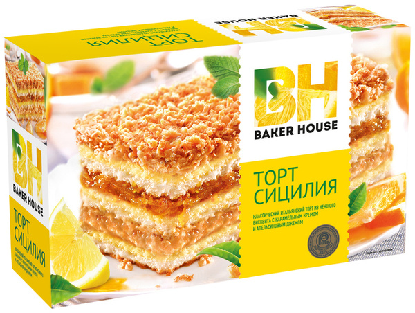 Торт бисквитный Baker House Сицилия с апельсином - классический итальянский торт с джемом из сочного апельсина, нежным кремом и посыпкой из меренги со вкусом миндаля. В каждом кусочке торта Baker House – частица солнечной Сицилии и море удовольствия.