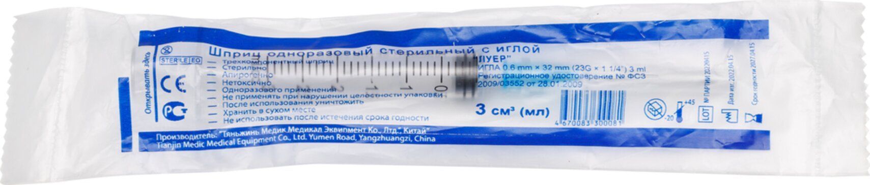 шприц 3мл.(3-х комп) с . иглой 0,6 мм*32мм /120шт
