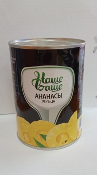 Ананасы Наше Ваше кольца - это ананасы тщательно очищенные от кожуры, нарезанные кольцами стерилизованные и залитые сахарным сиропом. Могут стать прекрасным дополнением для салатов, десертов, а могут служить и самостоятельным готовым десертом с прекрасными вкусовыми качествами.